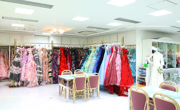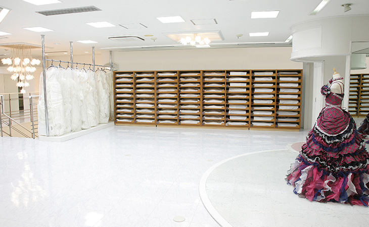 約500着の豊富なラインナップが自慢のドレスルームは、打ち合わせスペースも完備。